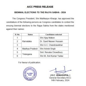 ರಾಜ್ಯಸಭಾ ಚುನಾವಣೆಯ ಹಿನ್ನೆಲೆಯಲ್ಲಿ ಮೂರು ರಾಜ್ಯಗಳ ಅಭ್ಯರ್ಥಿಗಳ ಪಟ್ಟಿಯನ್ನು ಕಾಂಗ್ರೆಸ್ ಬುಧವಾರ ಬಿಡುಗಡೆಗೊಳಿಸಿದೆ. ಕರ್ನಾಟಕದಿಂದ ಮೂವರು ಸ್ಪರ್ಧಿಸಲಿದ್ದಾರೆ. ಬೆಂಗಳೂರಿನ ಡಾ. ಸೈಯ್ಯದ್ ನಾಸೀರ್ ಹುಸೇನ್ ರಿಗೆ ಮತ್ತೊಮ್ಮೆ ಅವಕಾಶ ನೀಡಲಾಗಿದೆ. ಕರ್ನಾಟಕದಿಂದ ಕಾಂಗ್ರೆಸ್ನ ಹಿರಿಯ ಮುಖಂಡ ಅಜಯ್ ಮಾಕೆನ್, ಡಾ. ಸೈಯ್ಯದ್ ನಾಸೀರ್ ಹ...