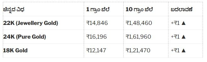- 22 ಕ್ಯಾರೆಟ್ ಚಿನ್ನ: ₹14,846 (ಪ್ರತಿ ಗ್ರಾಂ)